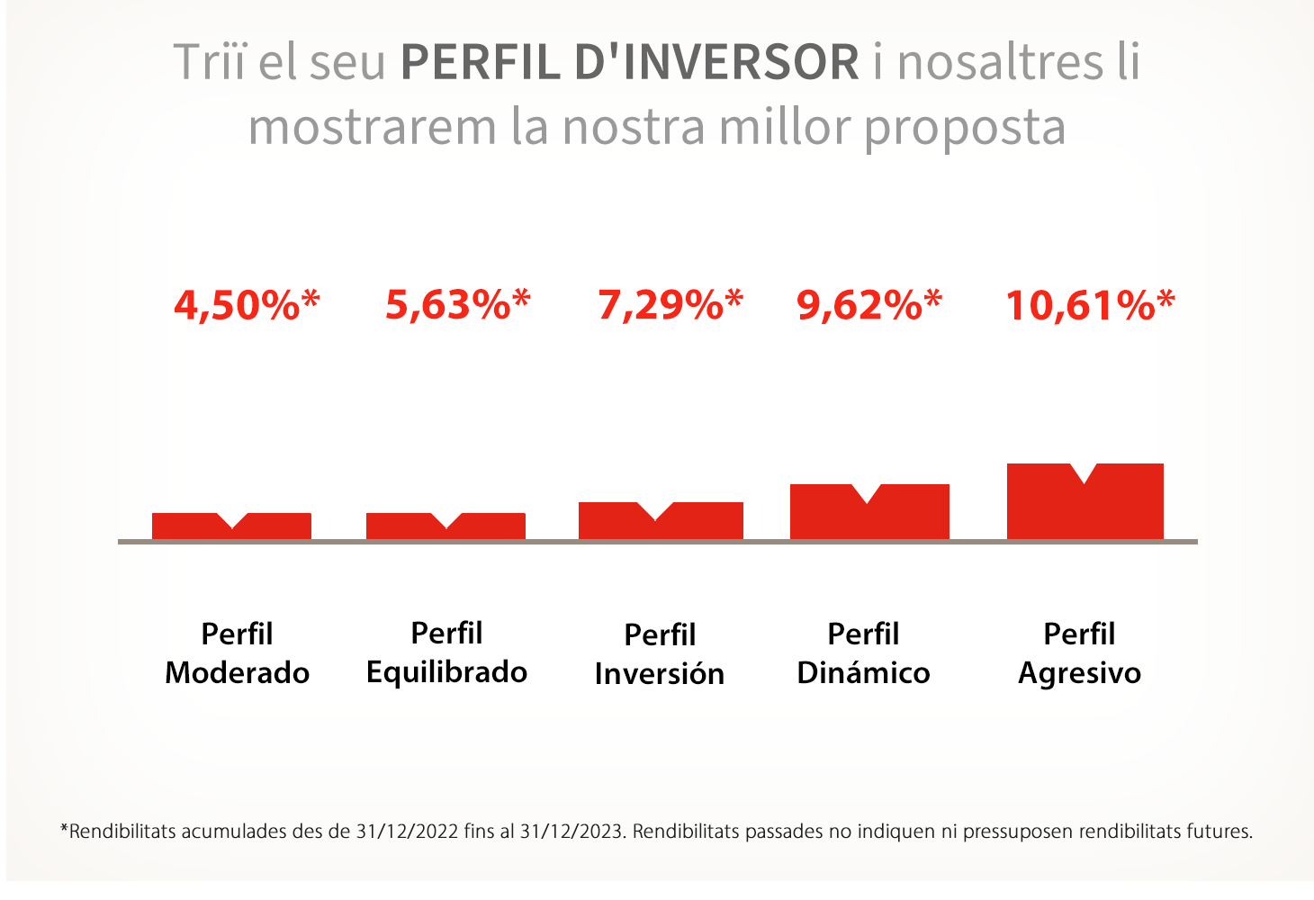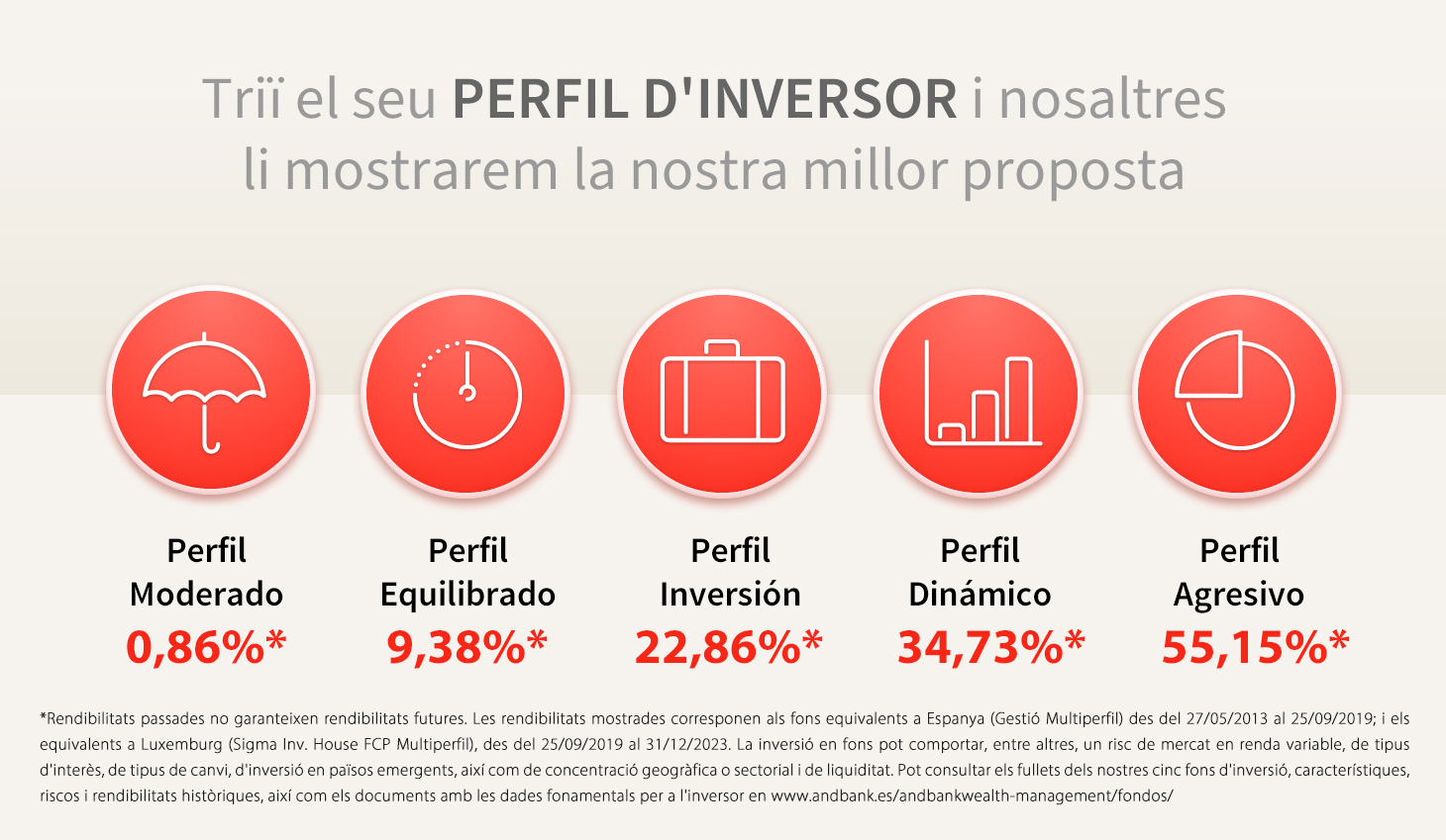 Gestión Multiperfil inclou cinc perfils d’inversió, que s’adapten a les necessitats de cada client. Des de Gestión Multiperfil Moderat -un perfil més defensiu amb la filosofia de preservació del capital- fins al Gestió Multiperfil Agressiu, amb el qual pot invertir fins a un 100% en renda variable. Els perfils d’inversió intermedis són equilibrat, inversió i dinàmic, amb percentatges màxims en renda variable de fins al 30%, 50% i 75%, respectivament.