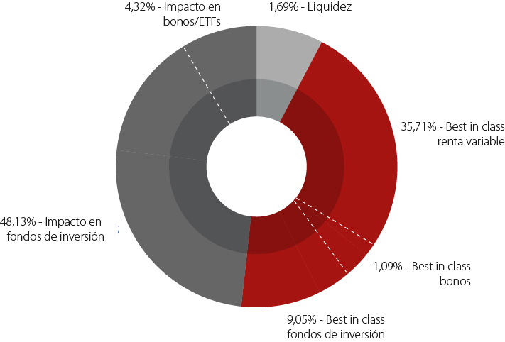 Best In Class: seleccionamos las mejores compañías, basándonos en los criterios ESG. Según nuestro modelo elegimos las que mejor valoración ESG tengan o aquellas que entendemos que están en proceso de tenerla. Utilizamos a estos efectos acciones, bonos y fondos de inversión.